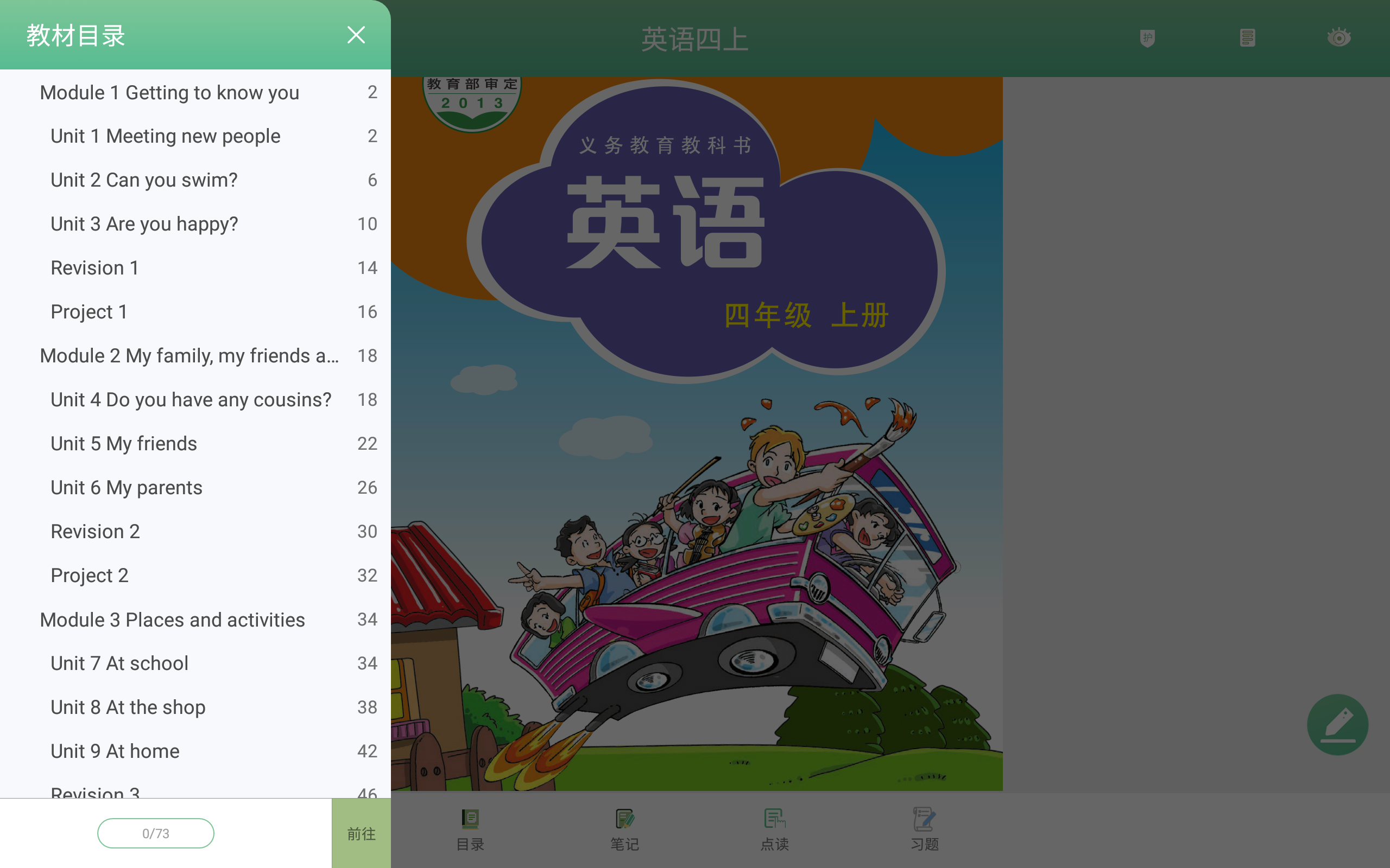 按钮,可查看课本的目录与具体章节。点击任意一个章节或单元,则直接跳转到相应页面。