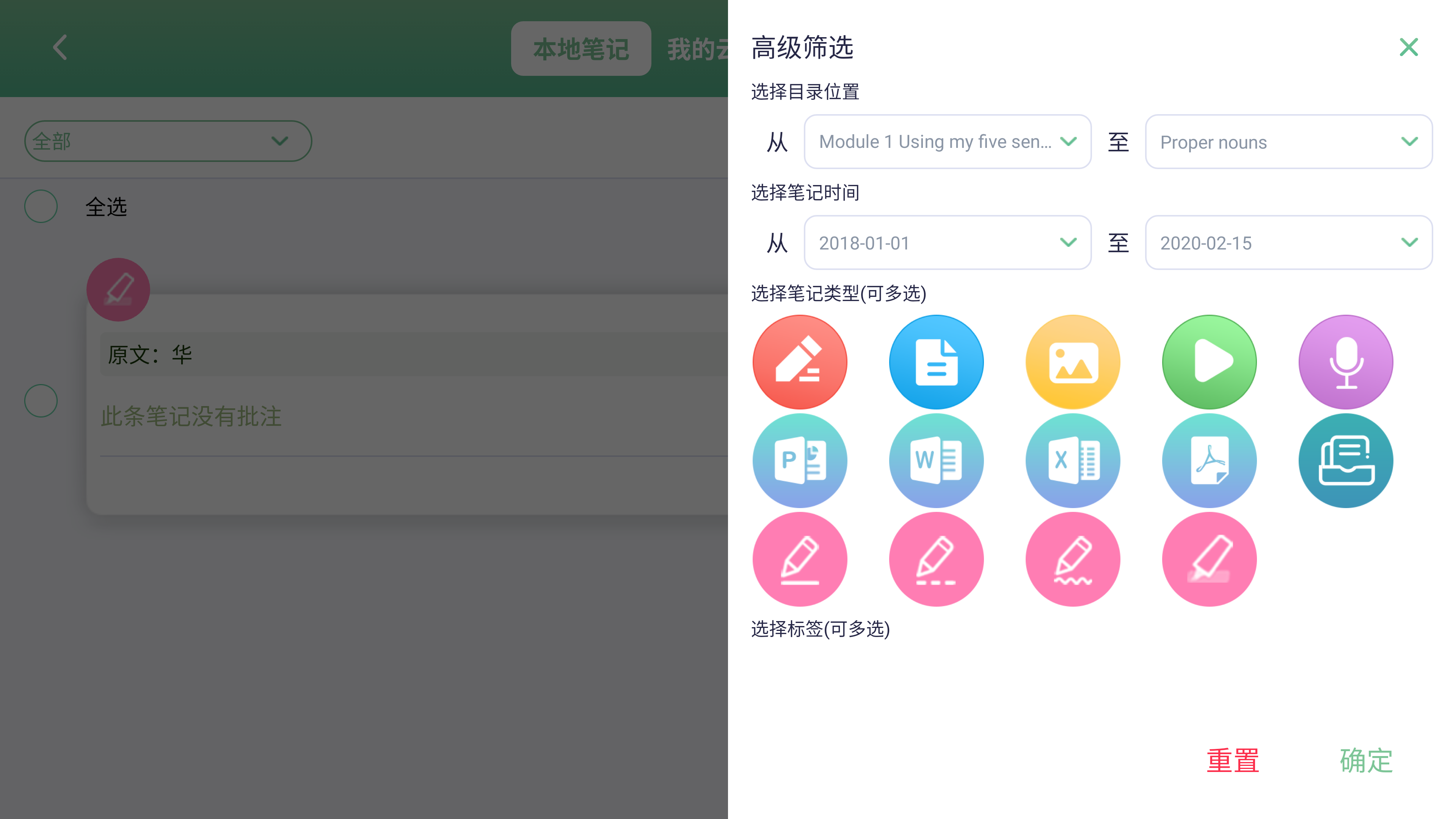 若用户希望查看某一类型或某几个章节的笔记,可以点击筛选按钮,从目录位置、笔记时间、笔记类型、标签四个维度对笔记进行筛选。筛选完成后,可以对笔记进行操作。
