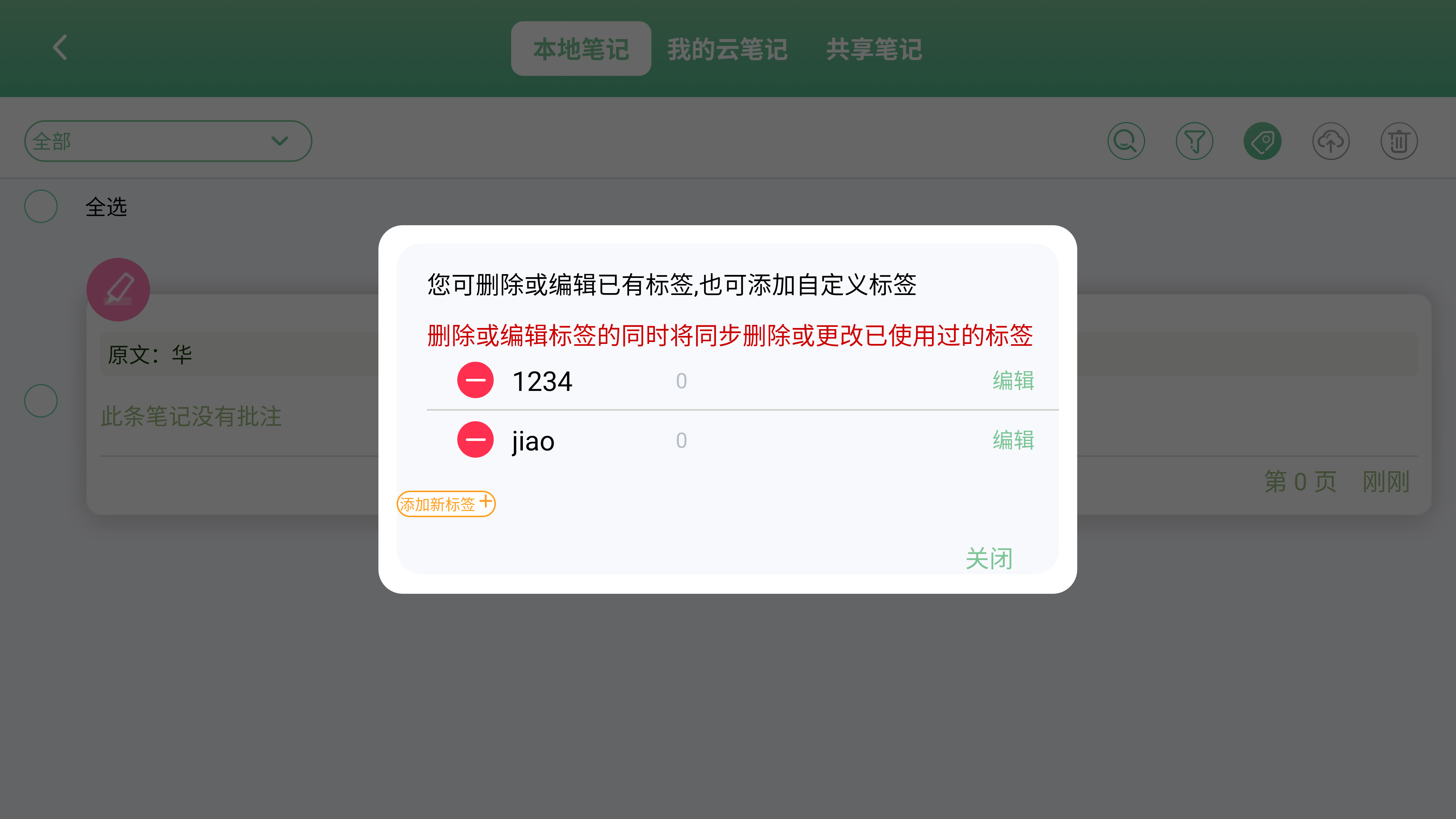 按钮,可以删除已有的标签。同一笔记最多支持5个标签,单标签的字数限制为4个字符,标签个数上限为20个。